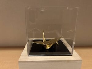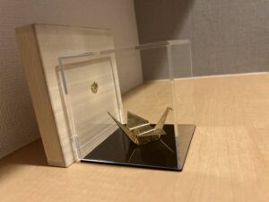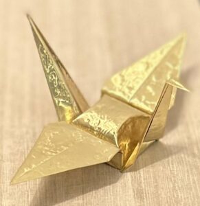 折鶴は精密な曲げ加工により、真鍮ならではの上品な輝きを保ちながらも柔らかさを表現しています。