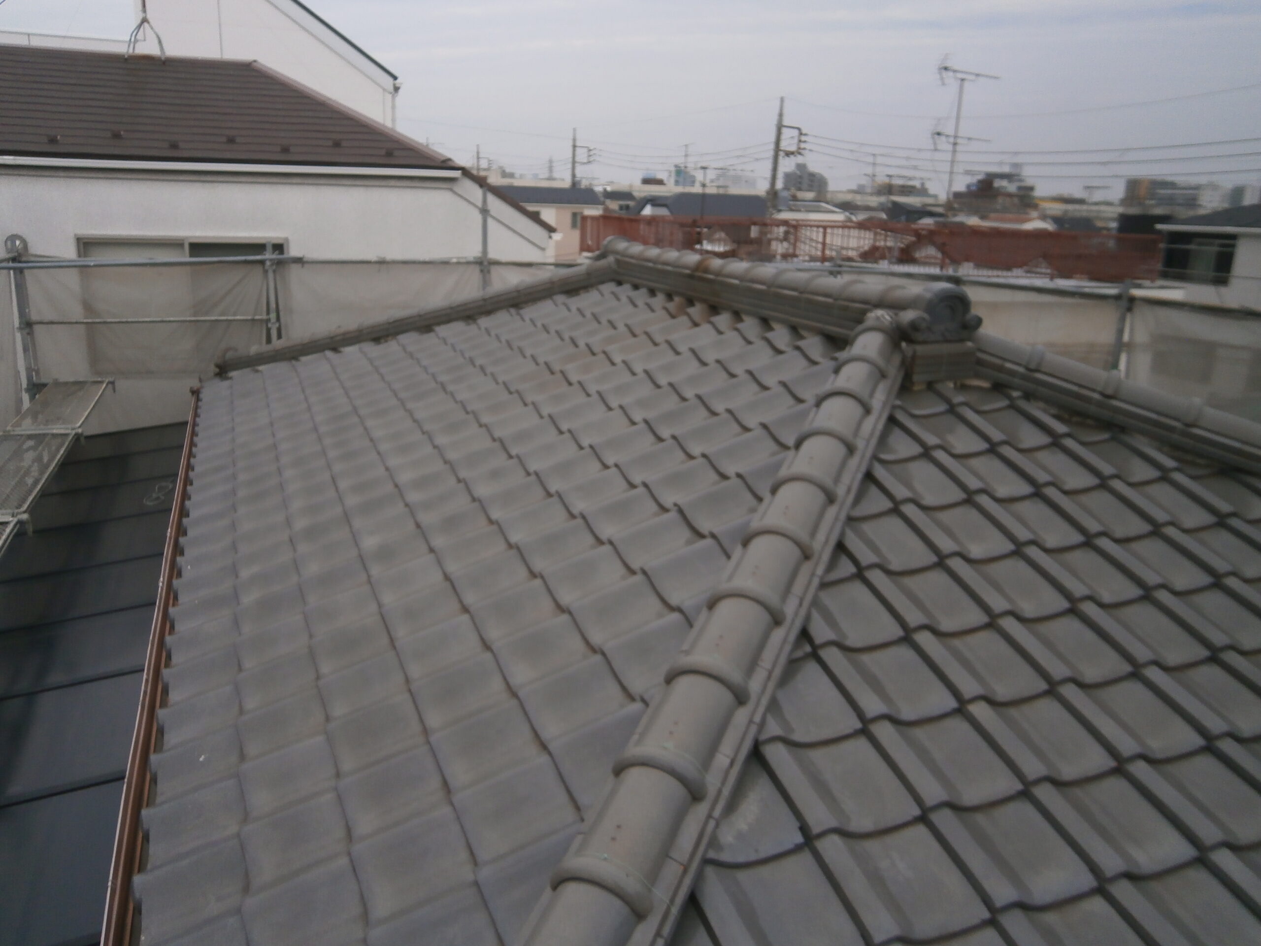 現地で屋根の状態を確認したところ、瓦自体に大きな割れなどは見られませんでしたが、築年数相応の経年劣化が見受けられました。