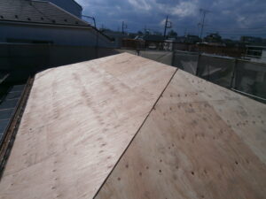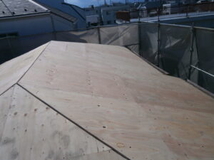 古い瓦や下地材を撤去した後、新しい野地板と防水シートを施工し、屋根の防水性能をしっかり確保しています。
